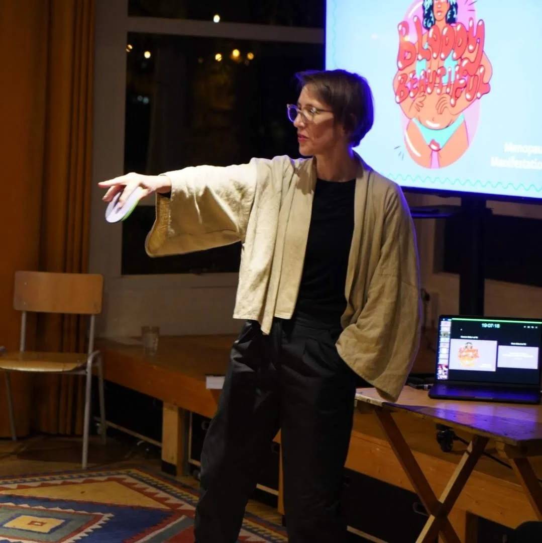 The second act, curated and presented by affect lab’s Juliette Brederode, offered a sharp yet playful survey of menopause in mainstream media. Juliette opened with a 1972 clip from All in the Family, one of the first televised mentions of menopause. Like many clips that followed, it used humour as a Trojan horse. In The Golden Girls (1987), Blanche Devereaux declares “life is over” after discovering she’s menopausal, echoing tired narratives of post-50 irrelevance. The standout moment came from Fleabag (2019), featuring Kristin Scott Thomas’s now-iconic monologue: “It is horrendous, but then it’s magnificent”—a line that now circulates as digital gospel on Instagram.